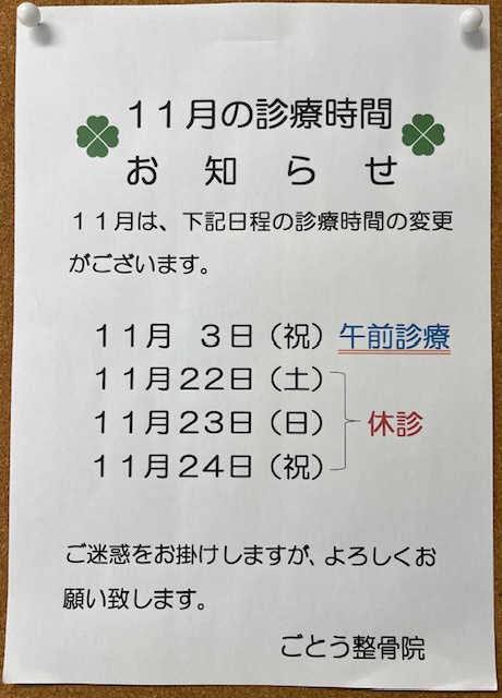 そんなわけで(←言い訳にならない)遅くなり申し訳ございません11月の休診日のお知らせです